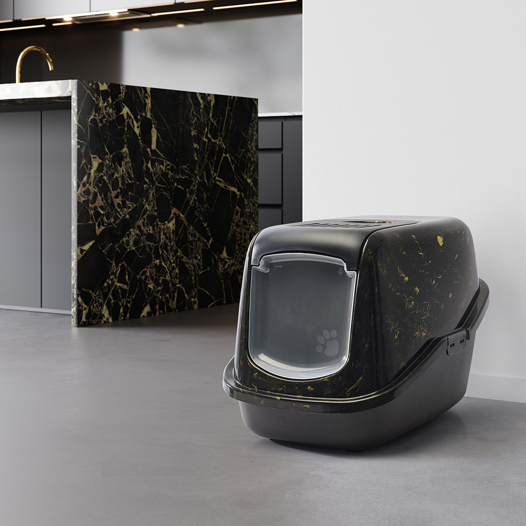 The Nestor Marble Grey White – stylish cat litter box combines modern functionality with timeless design, bringing refined marble elegance to your home. The grey and white marble-effect top contrasts beautifully with the sleek black base, creating a contemporary look that blends seamlessly with any interior.