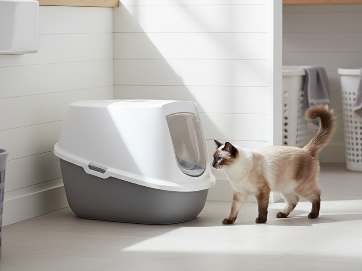 The hood of the Robin toilet home is securely fixed to the litter tray with easy-release clips, simplifying the process of cleaning. An integrated handle makes the toilet easy to move around, adding convenience for daily maintenance and placement adjustments.