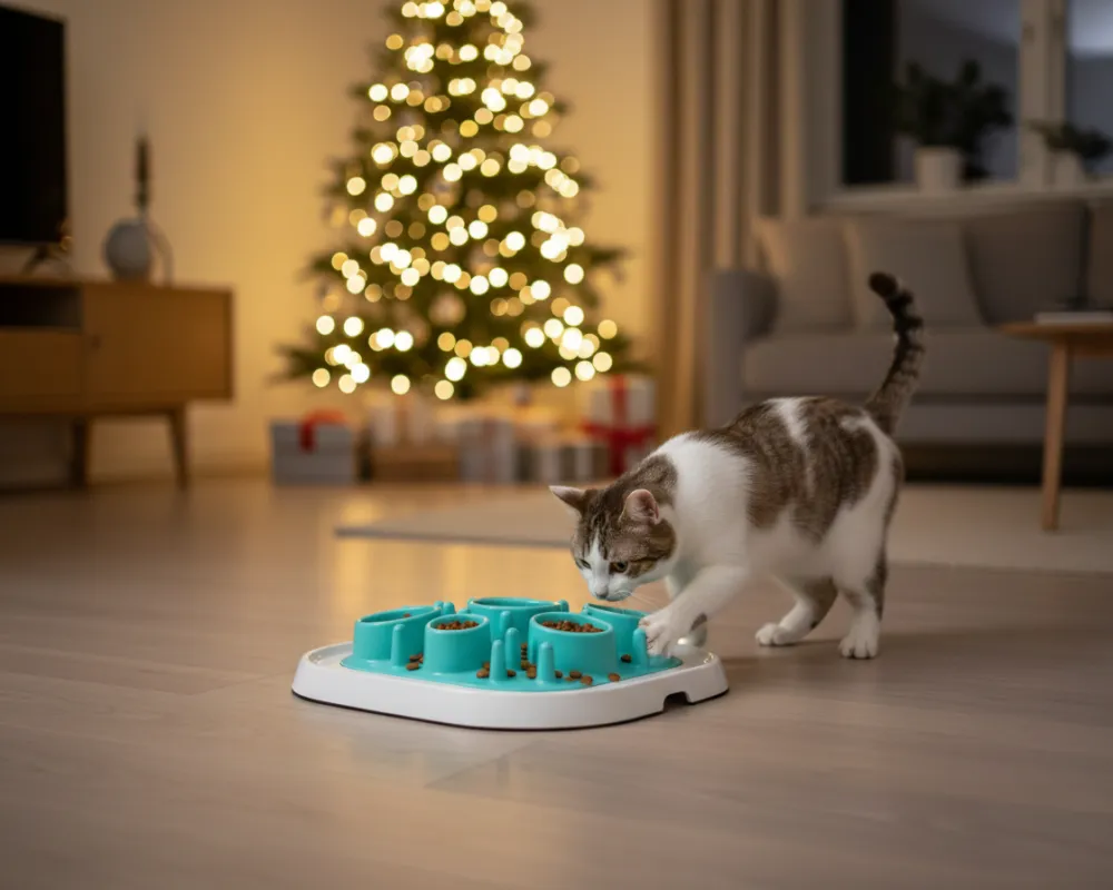 While people unwrap gifts, some cats feel bored or stressed by visitors and noise. The Pet Enigma puzzle is a smart way to give your cat focus and calm energy. It is a food puzzle that asks your cat to think, sniff and search for their reward.